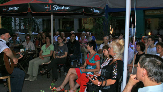 Im Verlauf des Abends war die Luft im Bürger-Treff so drückend schwül geworden, dass er sich kurzer Hand entschloss, den 2. Teil vor des Auftritts vor dem Bürger-Treff auf dem Fensterbrett sitzen, ganz ohne Technik zu gestalten.