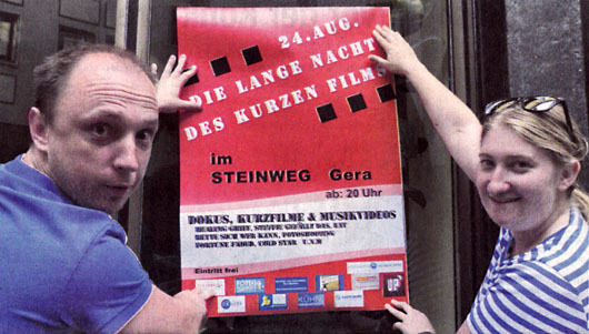 Die Filmemacher Marcel Dally und Merit Giesen mit einem Plakat der Kurzfilnacht.